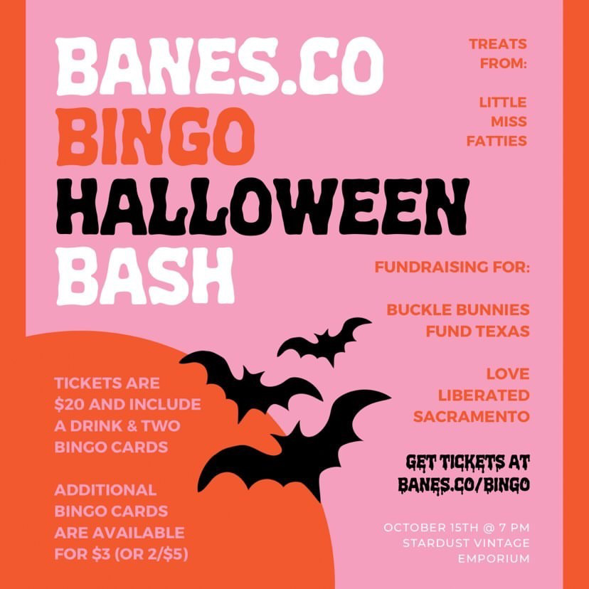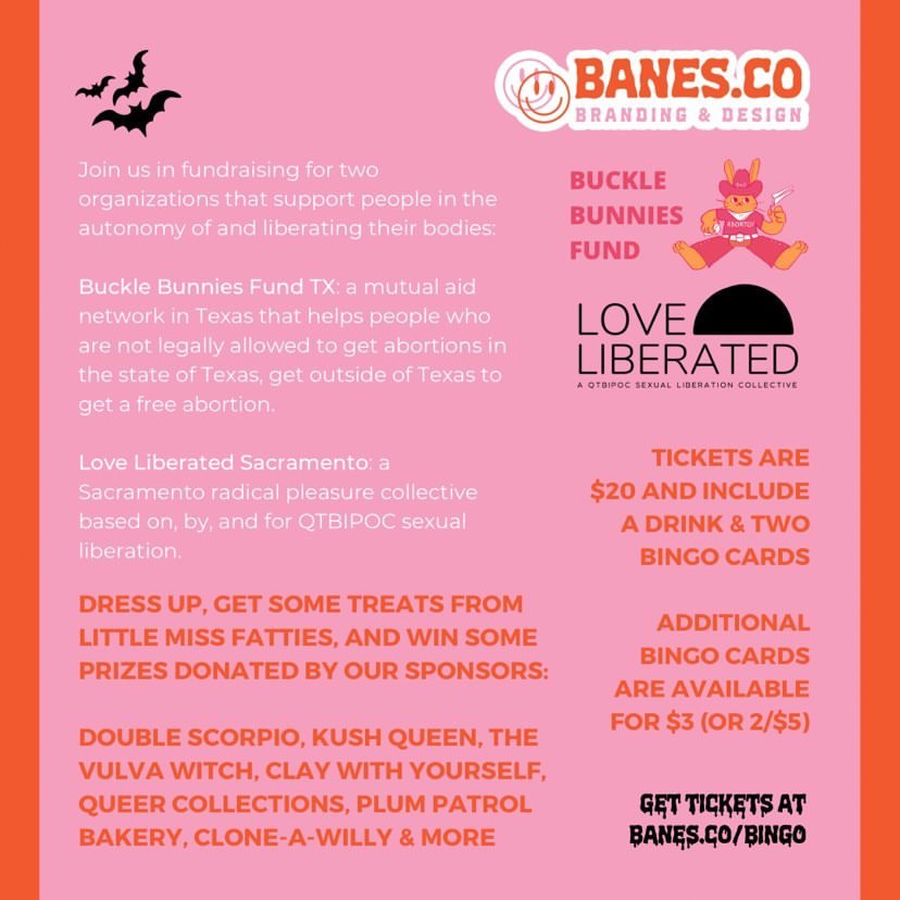 Love Liberated is so excited to be part of the BANES.CO HALLOWEEN BINGO BASH! This event is hosted by Banes Co! An all-inclusive social media marketing, branding, graphic, product & web design company. This event will be an halloween themed bingo fundraiser event fundraising for two queer led organizations who’s mission is dedicated to sexual liberation and bodily autonomy: Love Liberated Sacramento and Buckle Bunnies Fund TX.