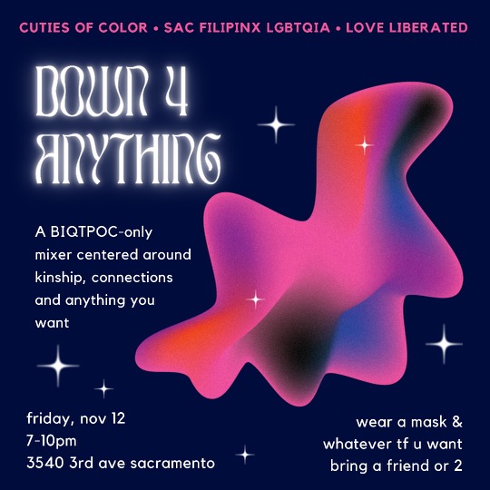 Down For Anything is a collaboration event hosted by Love Liberated, Cuties of Color, and Sacramento Filipinx LGBTQIA. This event will be a BIQTPOC-only mixer centered around kinship, connections and anything you want! You can have the chance to meet your next bestie or someone sexy. Please wear what makes you feel most confident and your cutest mask. Bring a friend or two! Wine, cheese & snacks will be provided.