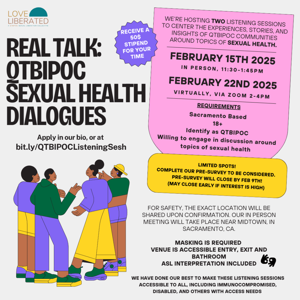 We love y’all. With all of our hearts. January has been a whirlwind to say the least, and community is more important now than ever. We see our trans and queer black and brown folk being targeted, we see our reproductive rights being heavily impacted. It’s time for us to work together and support each other more than ever. We stand for QTBIPOC Sexual liberation within Sacramento, and for us all across the states. We want to know how we can meet your needs in community when it comes to the sexual health information you need.